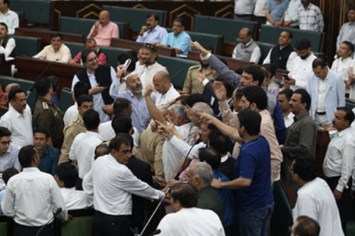 Repeated requests by the Speaker to the clashing MLAs to go back to their seats failed to calm the tempers as Awami Ittehad party (AIP) MLA, Khursheed Ahmad also joined Sajad Lone and Waheed Para in their verbal duel with the NC MLAs.