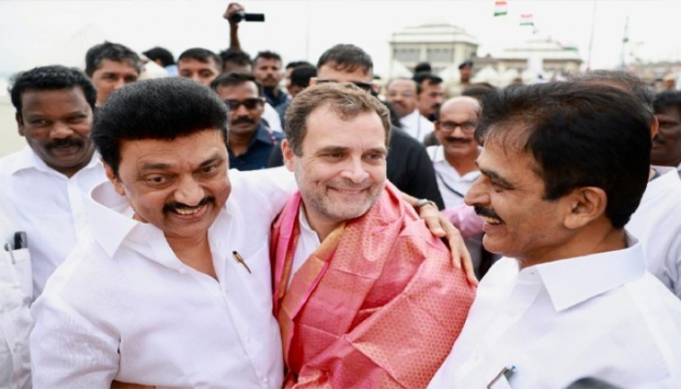 కాంగ్రెస్ పార్టీ అగ్రనేత రాహుల్ గాంధీకి తమిళనాడు సీఎం మద్దతు ప్రకటించారు. రాహుల్ గాంధీ భారత్ జోడో యాత్ర పేరిట బుధవారం ప్రారంభించిన పాద యాత్రకు డీఎంకే అధినేత, తమిళనాడు ముఖ్యమంత్రి ఎంకే స్టాలిన్ మద్దతు పలికారు. తమిళనాడులోని కన్యాకుమారి నుంచి రాహుల్ తన యాత్రను బుధవారం ప్రారంభించిన సంగతి తెలిసిందే. ఈ యాత్ర వద్దకు వచ్చిన స్టాలిన్... రాహుల్కు అభినందనలు తెలిపారు. ఈ సందర్భంగా రాహుల్ గాంధీని సన్మానించిన స్టాలిన్... పలు అంశాలపై ఆయనతో చర్చించారు.