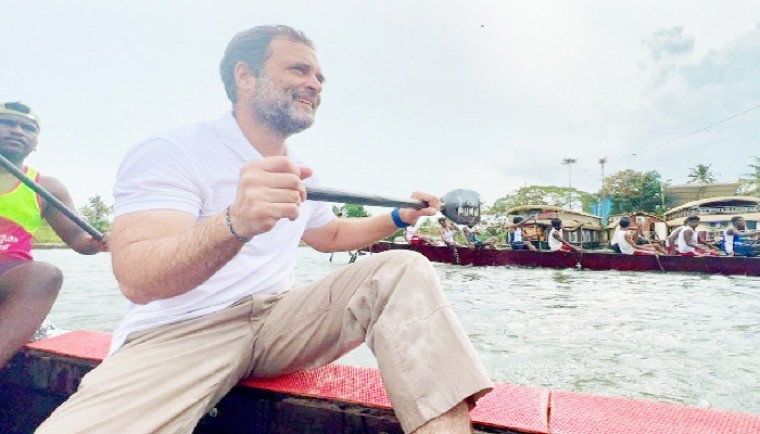 సోమవారం నాటి యాత్రలో భాగంగా కేరళలోని ఓ వాగులో జరిగిన స్నేక్ బోట్ రేసులో రాహుల్ గాంధీ పాల్గొన్నారు. ఈ సందర్భంగా పడవ సిబ్బంది, పార్టీ నేతలతో కలిసి ఉత్సాహంగా తెడ్డేశారు. తెడ్డేసిన నేపథ్యంలో కాస్తంత అలసట వచ్చినట్లు కనిపించిన రాహుల్ గాంధీ... తన కుడి చేతి భుజాన్ని ఎడమ చేతితో రుద్దుకున్నారు. ఇలా పడవ ఎక్కి తెడ్డేసిన రాహుల్ గాంధీ వీడియోలు, ఫొటోలు సోషల్ మీడియాలో వైరల్గా మారాయి.
