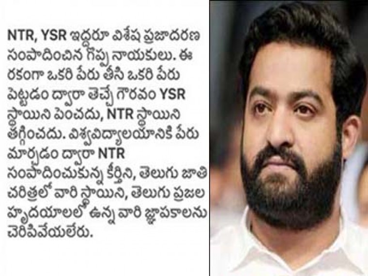 ఎన్టీఆర్ వర్సిటీ పేరు మార్పుపై జూ.ఎన్టీఆర్ స్పందించారు. 'ఎన్టీఆర్, వైఎస్ఆర్ ఇద్దరూ విశేష ప్రజాదరణ సంపాదించిన గొప్ప నాయకులు. ఒకరి పేరు తీసి ఒకరి పేరు పెట్టడం ద్వారా తెచ్చే గౌరవం వైఎస్ఆర్ స్థాయిని పెంచదు, ఎన్టీఆర్ స్థాయిని తగ్గించదు. పేరు మార్చడం ద్వారా ఎన్టీఆర్ సంపాదించుకున్న కీర్తిని, తెలుగుజాతి చరిత్రలో వారి స్థాయిని, తెలుగు ప్రజల హృదయాలలో ఉన్న వారి జ్ఞాపకాలను చెరిపివేయలేరు' అని ట్వీట్ చేశారు.