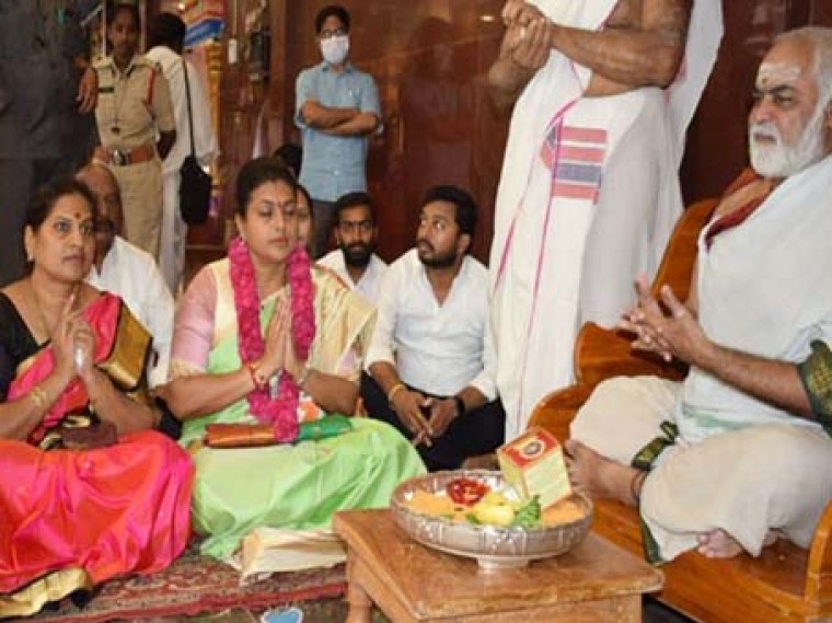 ఏపీ రాష్ట్ర సాంస్కృతిక పర్యాటక శాఖ మంత్రి ఆర్కే రోజా గురువారం కనకదుర్గమ్మ సేవలో తరించారు. ఆలయంలో దసరా శరన్నవరాత్రి మహోత్సవాల ఏర్పాట్లను అధికారులు ఇతర మంత్రులతో కలసి ఆమె పరిశీలించారు. అనంతరం దుర్గమ్మ సేవలో పాల్గొని పూజలు చేశారు. ఆలయ అధికారులు వేద పండితులు ఆహ్వానం పలికి వేద ఆశీర్వచనాలు అందించారు. శేష వస్త్రం, అమ్మవారి ప్రసాదం అందజేశారు.