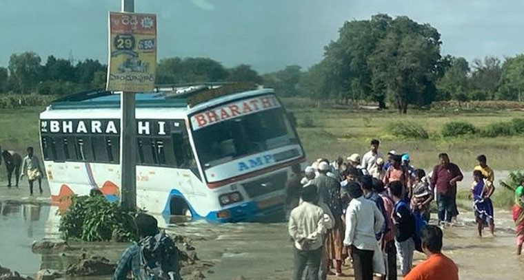 శ్రీసత్య సాయి జిల్లా పెనుగొండ నియోజకవర్గం సోమందేపల్లి మండలం లోని వానపల్లి వద్ద హిందూపురం పెనుకొండ రహదారిలో ఓ ప్రైవేటు బస్సు నీటిలో చిక్కుకుంది. స్థానికులు అందించిన సమాచారం మేరకు హిందూపురం నుండి పెనుకొండ కు వస్తున్న బస్సు బ్రాహ్మణ పల్లి వద్ద నీటి ప్రవాహం లో చిక్కుకుంది. పూర్తి వివరాలు తెలియాల్సి ఉంది. బస్సు నీటిలో చిక్కుకోవడంతో వాహన రాకపోకలు స్తంభించి ట్రాఫిక్ స్తంభించింది.