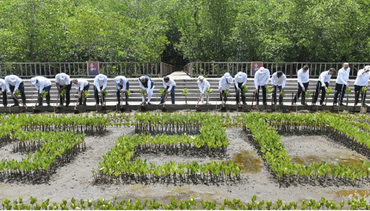 మడ అడవులలో వివిధ దేశాధినేతలు ఆశీసులయ్యారు. జీ20 సదస్సు కోసం భారత్, అమెరికా సహా పలు దేశాల అధినేతలు ప్రస్తుతం ఇండోనేషియాలో వాలిపోయారు. సోమవారం రాత్రికే బాలి చేరుకున్న ఆయా దేశాధినేతలు... మంగళవారం తొలి రోజు సమావేశాల్లో మునిగిపోయారు. అంతుకుముందు కుశల ప్రశ్నలతో ఒకరినొకరు పలకరించుకున్న దేశాధినేతలు ఫొటోలకు ఫోజులిచ్చారు. తాజాగా సదస్సుకు హాజరైన దేశాల అధినేతలంతా బుధవారం ఇండోనేషియాలోని అతి పెద్ద మడ అడవులను సందర్శించారు.