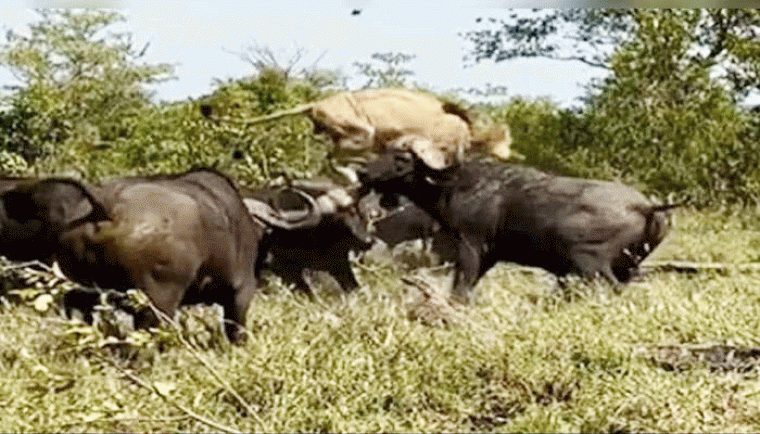 అన్ని వేళలు మనవి ఉండవు అన్నది ఈ ఘటనతో మరోసారి రుజువైంది. ఏకంగా ఓ సింహాన్ని ఓ దున్నల గ్రూప్ చితకబదింది. సింహాన్ని మృగరాజు.. అడవికి రాజు అని అంటారు. అయితే, సింహాలు ఒంటరిగా ఉండవు. 5 నుంచి 16 దాకా కలిసి గుంపులుగా జంతువులను వేటాడుతుంటాయి. ఇలా, గుంపుగా వేటకు వెళ్లి సింహాలు.. అడవి దున్నలపై దాడిచేశాయి. అవి అనూహ్యంగా ఎదురుదాడి చేయడంతో గుంపు పలాయనం చిత్తగించింది. కానీ, ఓ ముసలి సింహం ఆ మందకు చిక్కి చావుదెబ్బలు తింది. ప్రస్తుతం వీడియో ప్రస్తుతం ఇంటర్నెట్లో వైరల్ అవుతోంది. ఈ వీడియో క్లిప్ను డియోన్ కెల్బ్రిక్ అనే ఫోటోగ్రాఫర్ తన ఇన్స్టాగ్రామ్లో షేర్ చేశాడు. సఫారీ పర్యాటకుల బృందంతో కలిసి పంచుకున్న ఈ వీడియోలో సింహాన్ని గేదెల తమ కొమ్ములతో పొడిచి దాడి చేసి, ఎత్తిపడేయడం గమనార్హం.