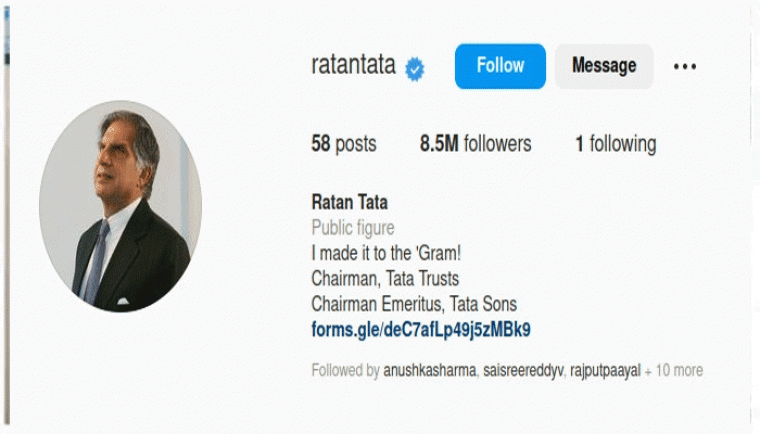 ఆయన నుంచి వచ్చే పోస్టులు తక్కువే అయినప్పటికీ, ఆయనను లక్షల సంఖ్యలో అనుసరిస్తుంటారు. రతన్ టాటాకు ఇన్ స్టాగ్రామ్ లో 85 లక్షల మంది ఫాలోవర్లు ఉన్నారు. అయితే ఆయన ఫాలో అయ్యేది మాత్రం ఒక్కరినే. టాటా గ్రూపు తరఫున సామాజిక సేవా కార్యక్రమాలు నిర్వహించే టాటా ట్రస్ట్ ను ఆయన ఫాలో అవుతుంటారు.