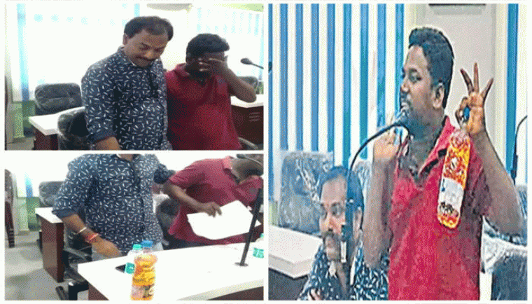 శుక్రవారం జంగారెడ్డిగూడెం మున్సిపల్ సమావేశంలో ఛైర్పర్సన్ బత్తిన లక్ష్మి అధ్యక్షతన జరిగింది. తన వార్డు పరిధిలోని సమస్యలను ఛైర్పర్సన్ దృష్టికి తీసుకెళ్లారు. తన వివక్షత ఉందని.. పెట్రోల్ పోసుకుని నిప్పటించుకుంటానన్నారు. వెంటనే ఆ పక్కన ఉన్న మరో కౌన్సిలర్ తాతాజీ వారించారు. సురేష్ చేతిలో సీసా లాగేసుకున్నారు. మున్సిపాలిటీ పరిధిలోని వార్డుల్లో పనులు చేస్తున్నా.. తన వార్డులో మాత్రం పనులు సాగడం లేదన్నారు.