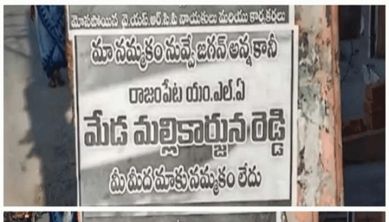 ఉమ్మడి కడప జిల్లా (ప్రస్తుతం అన్నమయ్య జిల్లా) రాజంపేట వైఎస్సార్సీపీ ఎమ్మెల్యే మేడా మల్లికార్జున రెడ్డి పై సొంత పార్టీ నేతలు, కార్యకర్తల నుంచి తిరుగుబాటు మొదలైంది. ఎమ్మెల్యే తీరుపై సొంత పార్టీ వాళ్లే పోస్టర్లు అంటించారు. ఎమ్మెల్యేకు వ్యతిరేకంగా ఉండే అసమ్మతి నేతలు. రాజంపేటలోని ప్రధాన ప్రాంతాల్లో పోస్టర్లు అంటించడం అధికారపార్టీలో కలకలంరేపుతోంది. ఆ పోస్టర్లలో 'మా నమ్మకం నువ్వే జగనన్న.. కానీ రాజంపేట ఎమ్మెల్యే మేడా మల్లికార్జున రెడ్డి మీద మాకు నమ్మకం లేదు. ఇట్లు మోసపోయిన వైఎస్సార్సీపీ నాయకులు, కార్యకర్తలు' అంటూ పోస్టర్లు ముద్రించి గోడలకు అంటించారు.