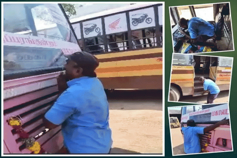 తమిళనాడుకు చెందిన ఓ ఆర్టీసీ డ్రైవర్ తన పదవీ విరమణ రోజున భావోద్వేగానికి గురయ్యాడు. బస్సును, స్టీరింగ్ను ప్రేమగా ముద్దాడాడు. బస్సు ముందు భాగాన్ని హత్తుకొని భావోద్వేగంతో కన్నీళ్లు చెమర్చాడు. ఇందుకు సంబంధించిన వీడియో సోషల్ మీడియాలో వైరల్గా మారింది. మధురై జిల్లా బైకరాకు చెందిన ముత్తుపాండి కొంత కాలంగా తిరుపరంగునం ఆర్టీసీ డిపో వర్క్షాప్లో పనిచేస్తున్నారు. అంతకుముందు ఆయన తిరుపరంగునం పట్టణంలో చాలా సంవత్సరాలు ఆర్టీసీ బస్సు నడిపారు. ఆర్టీసీలో 30 ఏళ్లుగా పనిచేసిన ముత్తుపాండి నాలుగు రోజుల కిందట తనకు 60 ఏళ్లు నిండటంతో పదవీ విరమణ చేశారు. అయితే, ఉద్యోగంలో తన చివరి రోజు ఇన్నాళ్లూ తాను నడిపిన ప్రభుత్వ బస్సును నడుపుతానని ఆయన కోరారు. అందుకు అధికారులు అనుమతించారు.