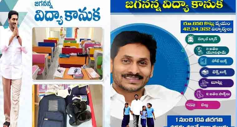 ముఖ్యమంత్రి వైయస్ జగన్ మోహన్ రెడ్డి కొద్దిసేపటి క్రితమే తాడేపల్లి నుంచి పల్నాడు జిల్లా క్రోసూరుకు బయలుదేరారు. రాష్ట్రంలో ఇవాళ్టి నుంచి పాఠశాలలు పునఃప్రారంభం అవుతుండగా.. తొలిరోజే ప్రభుత్వం విద్యాకానుక అందిస్తోంది. వరుసగా నాలుగో ఏడాది సీఎం వైయస్ జగన్ ‘జగనన్న విద్యాకానుక’ కిట్ను అందజేయనున్నారు. ప్రతి విద్యార్థికి ఉచితంగా బైలింగ్యువల్ పాఠ్య పుస్తకాలు, నోట్బుక్స్, వర్క్బుక్స్, కుట్టు కూలితో సహా మూడు జతల యూనిఫామ్ క్లాత్, ఒక జత బూట్లు, రెండు జతల సాక్సులు, బెల్టు, స్కూలు బ్యాగుతోపాటు ఆక్స్ఫర్డ్ డిక్షనరీ (6–10 తరగతి పిల్లలకు), పిక్టోరియల్ డిక్షనరీ (1–5 తరగతి పిల్లలకు)తో కూడిన జగనన్న విద్యాకానుక కిట్ల పంపిణీ చేయనున్నారు.