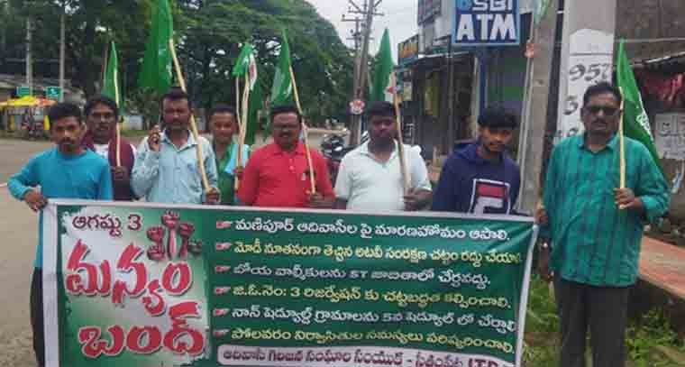 మణిపూర్లో ఆదివాసీలపై జరుగుతున్న అత్యాచారాలు, అఘాయిత్యాలకు వ్యతిరేకంగా రాష్ట్ర మన్యం బంద్ అల్లూరి జిల్లాలో విజయవంతమైంది. ఇందులో భాగంగా పాడేరులో వ్యాపారులు స్వచ్ఛందంగా దుకాణాలను మూసివేసి మద్దతు పలికారు. గిరిజన సంఘం నాయకులు ఉదయం ఐదు గంటలకే పీటీడీ కాంప్లెక్స్కు చేరుకొని బస్సులను బయటకు రాకుండా చేశారు. ప్రైవేటు వాహనాలు కూడా నిలిచిపోయాయి. గిరిజన సంఘం రాష్ట్ర కార్యవర్గ సభ్యుడు పి.అప్పలనర్స మాట్లాడుతూ మణిపూర్ ఘటనకు అడ్డుకట్ట వేసేందుకు కేంద్ర, రాష్ట్ర ప్రభుత్వాలు చర్యలు చేపట్టక పోవడం విచారకరమన్నారు. దేశంలోని ఆదివాసీలను రక్షించాలని, అటవీ సంరక్షణ చట్టాన్ని ఉపసంహరించుకోవాలని, ఉమ్మడి పౌరస్మృతి పరిధి నుంచి ఆదివాసీలను మినహాయించాలి, బోయవాల్మీకి, బోంతు ఒరియాలను ఎస్టీ జాబితాలో చేర్చరాదని, రాష్ట్రంలో రద్దు చేసిన జీవో నంబరు 3కు చట్టభద్రత కల్పించాలని, పోలవరం వరద బాధితులకు పునరావాస కేంద్రాలు కల్పించాలని, చింతపల్లి, అనంతగిరి మండలాల్లో పవర్ ప్రాజెక్టు రద్దు చేయాలని డిమాండ్ చేశారు.
