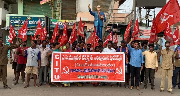 మున్సిపల్ కార్మికులపై పెట్టిన అక్రమ కేసులను ప్రభుత్వం వెంటనే ఉపసంహరించుకోవాలని సీఐటీయూ జిల్లా కార్యదర్శి సిహెచ్ రామ్మూర్తి నాయుడు డిమాండ్ చేశారు. గురువారం రాజాం పట్టణంలో అంబేద్కర్ విగ్రహం వద్ద ప్రభుత్వ నిర్బంధాన్ని నిరసిస్తూ జరిగిన కార్యక్రమంలో డిమాండ్ చేశారు. మున్సిపల్ కార్మికులకు, కాంట్రాక్ట్ ఔట్సోర్సింగ్ విధానాన్ని అరు మాసాల్లో రద్దు చేస్తామని ఇచ్చిన హామీలను అమలు చేయాలని కోరారు