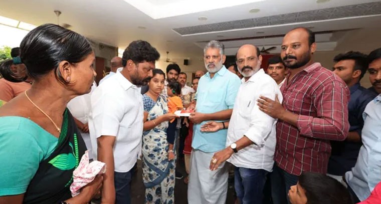 తిరుపతి రూరల్ మండలం వెంకటపతి నగర్ కు చెందిన శ్రీనివాసులు ఇటీవల ప్రమాద వసాత్తు కాలు జారి కింద పడి తీవ్రగాయాలతో ఆసుపత్రికి చేరి చికిత్స పొందుతూ మృతి చెందాడు. స్థానిక సర్పంచ్ చిన్నియాదవ్ ఆ కుటుంబానికి అండగా నిలిచారు. ఎమ్మెల్యే చెవిరెడ్డి చొరవతో ప్రభుత్వం నుంచి వైఎస్ఆర్ భీమా పథకం కింద రూ. 5లక్షలు మంజూరు చేయించారు. తుమ్మలగుంట ఎమ్మెల్యే నివాసం వద్ద ఆదివారం రూ. 5లక్షలు చెక్కును మృతుని భార్య శోభనకు అందించారు.