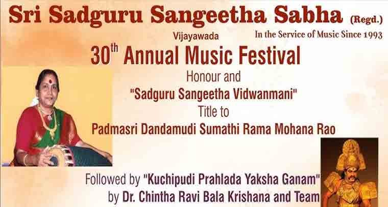 శ్రీ సద్గురు సంగీత సభ 30వ వార్షిక సంగీత మహోత్సవాలు ఈ నెల 4నుంచి 11వరకు విజయవాడ, దుర్గాపురంలోని శ్రీ ఘంటసాల వెంకటేశ్వరరావు ప్రభుత్వ సంగీత కళాశాలలో జరగనున్నట్టు కళాశాల కార్యదర్శి పోపూరి గౌరీనాథ్ ఒక ప్రకటనలో తెలిపారు. సుప్రసిద్ధ సంగీత విద్వాంసుల కచేరీలతో పాటు ఏటా ఇస్తున్నట్టు ఈ ఏడాది కూడా సంగీతం, నృత్యంలో ప్రతిభ కనబరుస్తున్న యువతకు నగదు పురస్కారాలు, పేద కళాకారులకు ఆర్థిక చేయూత అందజేస్తామన్నారు. అలాగే సద్గురు సంగీత విద్వన్మణి బిరుదు ఈ ఏడాది విఖ్యాత మృదంగ విదుషీమణి, పద్మశ్రీ దండమూడి సుమతీ రామ మోహనరావుకు అందించనున్నట్టు తెలిపారు. అలాగే నాట్యాచార్య చింతా రవి బాలకృష్ణ శిష్య బృందం చే భక్త ప్రహ్లాద కూచిపూడి యక్షగానం ప్రదర్శింపబడుతుందన్నారు.