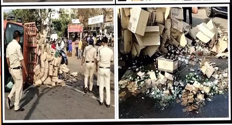 విశాఖపట్నం జిల్లా మధురవాడలో మద్యం బాటిళ్ల లోడుతో వెళ్తున్న వాహనం నడిరోడ్డుపై బోల్తా పడింది. దీంతో కొన్ని కాటన్ల బాటిళ్లు రోడ్డుపై పడి పగిలిపోయాయి. మరికొన్ని కాటన్లలోని మద్యం బాటిళ్లను తీసుకెళ్లడానికి స్థానికులు ఎగబడ్డారు. అందినకాడికి మద్యం బాటిళ్లను తీసుకెళ్లారు. వారిని నిలువరించేందుకు డ్రైవర్ విఫలయత్నం చేశాడు. సమాచారం అందుకున్న పోలీసులు హుటాహుటిన ఘటనా స్థలానికి చేరుకున్నారు. స్థానికులను చెదరగొట్టి, మందు బాటిళ్లను తస్కరించకుండా వాహనం వద్ద రక్షణ కల్పించారు. మధురవాడలోని కొమ్మది వద్ద శనివారం (నవంబర్ 11) మధ్యాహ్నం ఈ ఘటన చోటు చేసుకుంది. భారీ క్రేన్ సాయంతో వాహనాన్ని పక్కకు తొలగించారు. ట్రాఫిక్ పోలీసులు ట్రాఫిక్ రద్దీని క్రమబద్దీకరించి, రాకపోకలను పునరుద్ధరించారు. అతివేగం, సామర్థ్యానికి మించి లోడు వేయడం ప్రమాదానికి కారణంగా తెలుస్తోంది. మద్యం బాటిళ్ల లోడుతో ఐచర్ వాహనం.. ఆనందపురం నుంచి విశాఖ వైపు వెళ్తున్న సమయంలో ఈ ప్రమాదం చోటు చేసుకుంది. ఘటనకు సంబంధించిన పూర్తి వివరాలు తెలియాల్సి ఉంది.