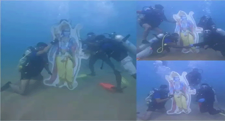 ఒక అద్భుతమైన వేడుకలో.. ఈ శుభ సందర్భానికి గుర్తుగా ఒక వినూత్నమైన ప్రయత్నం చేశారు. లైవిన్ అడ్వెంచర్స్కు చెందిన డైవర్లు ప్రత్యేకంగా రూపొందించిన బోర్డుపై శ్రీరాముడి ఫోటోను నీటి అడుగున ప్రదర్శించారు. విశాఖలో స్కూబా డైవింగ్ బృందం ఈ వినూత్న ప్రయత్నం చేసింది.. రుషికొండ సముద్రపు లోతుల్లోకి శ్రీరాముడి ఫోటోతో వెళ్లింది. ఇలా సముద్రపు లోతుల్లో శ్రీరాముడి చిత్రపటాన్ని ప్రదర్శించారు. ఓ అద్భుతాన్ని ఆవిష్కరించారు. ఈ కార్యక్రమంలో సంప్రదాయాన్ని కూడా పాటిస్తూ నిర్వహించారు. అయోధ్యలో జరుగుతున్న అద్భుత వేడుకకు తమవంతుగా ఇలా సముద్రం నీటి అడుగున ఇలా శ్రీరాముడి ఫోటోను ప్రదర్శించారు. తాము కూడా.. ఇలా వినూత్నంగా ఈ కార్యక్రమంలో భాగస్వామ్యం కావడం ఎంతో ఆనందంగా ఉందన్నారు డైవర్లు.