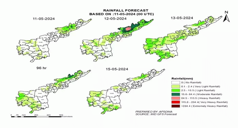 ఆంధ్రప్రదేశ్లో వర్షాలు పడతాయంటోంది వాతావరణశాఖ. వచ్చే ఐదు రోజులు వానలు కురుస్తాయని అంచనా వేస్తున్నారు. ఇవాళ శ్రీకాకుళం, పార్వతీపురం మన్యం, అల్లూరి సీతారామరాజు, విజయనగరం, విశాఖపట్నం, అనకాపల్లి, కాకినాడ, డాక్టర్ బీఆర్ అంబేద్కర్ కోనసీమ, తూర్పుగోదావరి, పశ్చిమ గోదావరి, ఏలూరు, కృష్ణా, ఎన్టీఆర్ జిల్లాల్లో అక్కడక్కడ పిడుగులతో కూడిన మోస్తరు నుంచి భారీవర్షాలు కురిసే అవకాశం ఉందని అంచనా వేస్తున్నారు. మరోవైపు పల్నాడు, ప్రకాశం, కర్నూలు, నంద్యాల, అనంతపురం, శ్రీసత్యసాయి జిల్లాల్లో అక్కడక్కడ పిడుగులతో కూడిన తేలికపాటి వర్షం పడే అవకాశం ఉంది అంటున్నారు.