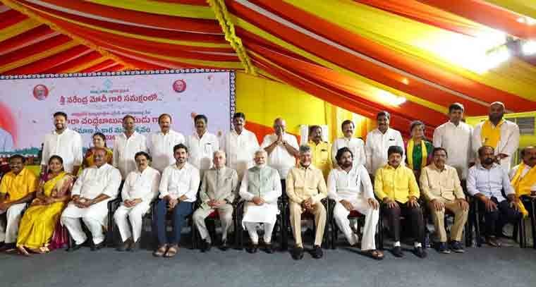 టీడీపీ అధినేత చంద్రబాబు నాయుడు ఏపీ ముఖ్యమంత్రిగా చేసిన ప్రమాణస్వీకార కార్యక్రమానికి అతిరథ మహారథులు హాజరయ్యారు. ప్రధానమంత్రి నరేంద్ర మోదీతో పాటు కేంద్రమంత్రులైన అమిత్ షా, జేపీ నడ్డా, నితిన్ గడ్కరీ, బండి సంజయ్ కుమార్ ఈ కార్యక్రమానికి విచ్చేశారు. అంతేకాదు.. మహారాష్ట్ర సీఎం ఏక్నాథ్ షిండేతో సహా మాజీ ఉపరాష్ట్రపతి వెంకయ్య నాయుడు, మాజీ సీజేఐ జస్టిస్ ఎన్వీ రమణ, తెలంగాణ మాజీ గవర్నర్ తమిళిసై సౌందరాజన్, బీజేపీ ఎంపీ పురంధేశ్విరి తదితరులు వచ్చారు.