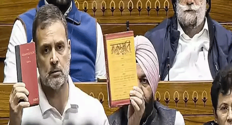 ఈ క్రమంలోనే రాజ్యాంగంపై హిందుత్వ సిద్ధాంత కర్త వీడీ సావర్కర్ గతంలో చేసిన వ్యాఖ్యలను లోక్సభలో రాహుల్ గాంధీ ప్రస్తావించారు. ఈ సందర్భంగా భారత రాజ్యాంగం, మనుస్మృతి మధ్య తేడాలను వివరించారు. మనుస్మృతి సిద్ధాంతాలను అనుసరించి రాజ్యాంగం ఉండాలని వీడీ సావర్కర్ పేర్కొన్నారని.. కానీ రాజ్యాంగంలో అంబేద్కర్, మహాత్మాగాంధీ, జవహర్లాల్ నెహ్రూల ఆలోచనలు, వారి మాటలు వినిపిస్తాయని తెలిపారు. రాజ్యాంగం అనేది ఆధునిక భారతదేశానికి సంబంధించిన ఓ డాక్యుమెంట్ అని.. కానీ ప్రాచీన భారత విలువలు కూడా అందులో ఉన్నాయని రాహుల్ గాంధీ పేర్కొన్నారు. భారత రాజ్యాంగాన్ని సావర్కర్ విమర్శిస్తే.. ప్రస్తుత బీజేపీ రాజ్యాంగ రక్షణ గురించి మాట్లాడుతోందని విమర్శించారు. "మీ ఆత్మబంధువును అవహేళన చేసినట్లు అనిపించడం లేదా’’ అని బీజేపీకి రాహుల్ గాంధీ చురకలు అంటించారు.