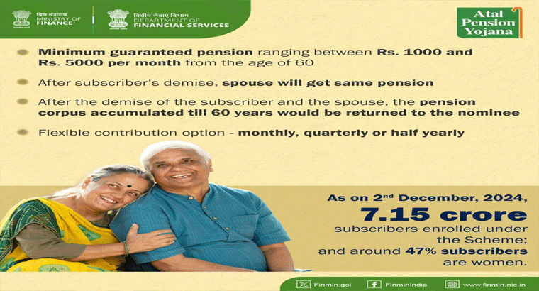 ఈ మేరకు సోషల్ మీడియా ఎక్స్ వేదికగా అటల్ పెన్షన్ యోజన గురించి పలు విషయాలు వెల్లడించింది. ' అటల్ పెన్షన్ యోజన కింద ఏడు కోట్ల కంటే ఎక్కువ మంది సబ్స్క్రైబర్లతో హామీ ఇవ్వబడిన పెన్షన్ బెనిఫిట్లతో సురక్షితమైన రిటైర్మెంట్ను అందిస్తోంది. దీని ద్వారా లబ్ధిదారులకు పదవీ విరమణ తర్వాత మనశ్సాంతి లభిస్తుంది. డిసెంబర్ 2, 2024 నాటికి మొత్తం 7.15 కోట్ల సబ్స్క్రైబర్లు తమ పేరును నమోదు చేసుకున్నారు. అందులో 47 శాతం మంది మహిళలే ఉన్నారు.' అని పేర్కొంది.