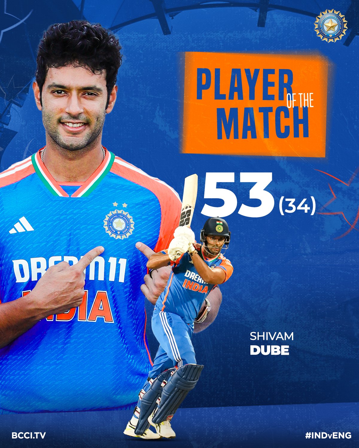 ఈ మ్యాచ్లోనూ భారత్ టాప్ ఆర్డర్ మరోసారి విఫలమైంది. ఓపెనర్లు సంజు శాంసన్ (1), అభిషేక్ శర్మ (29) తక్కువ పరుగులకే ఔటయ్యారు. ఆ తర్వాత క్రీజులోకి వచ్చిన తిలక్ వర్మ (0), సూర్యకుమార్ యాదవ్ (0) డకౌట్గా వెనుదిరిగారు. ఒకే ఓవర్లో మూడు వికెట్లు పడగొట్టి.. మహమూద్ భారత్ను తీవ్రంగా దెబ్బతీశాడు. అయితే మూడో డౌన్లో క్రీజులోకి వచ్చిన రింకు సింగ్ (30; 26 బంతుల్లో 4×4, 1×6) కాసేపు మెరుపులు మెరిపించాడు. అయితే, జట్టు స్కోరు 79 పరుగుల వద్ద కార్స్ బౌలింగ్లో భారీ షాట్కు ప్రయత్నించి రషీద్ చేతికి చిక్కాడు. కానీ ఆల్ రౌండర్లు శివమ్ దూబె (53; 34 బంతుల్లో 7×4,2×6), హార్దిక్ పాండ్య (53;30 బంతుల్లో 4×4, 4×6) వీరోచిత ఇన్నింగ్స్ ఆడారు. అర్ధశతకాలతో జట్టును ఆదుకున్నారు. శివమ్ దూబే ప్లేయర్ ఆఫ్ ది మ్యాచ్ గా నిలిచాడు.