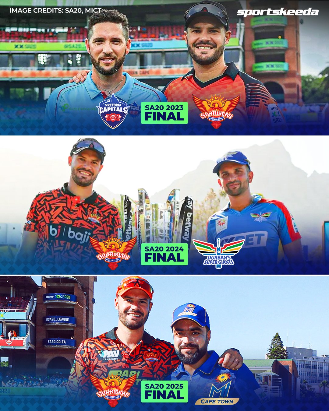 పార్ల్ రాయల్స్ నిర్దేశించిన 176 పరుగుల లక్ష్యాన్ని సన్రైజర్స్ కేవలం 19.2 ఓవర్లలోనే ఛేదించింది. ఓపెనర్ టోనీ డి జోర్జీ 49 బంతుల్లో 78 పరుగులు చేసి మెరుగైన ఇన్నింగ్స్ ఆడాడు. అతనికి జోర్డాన్ హెర్మాన్ అద్భుతమైన సహకారం అందించాడు. 48 బంతుల్లో 69 పరుగులు చేసిన అతను జట్టును గెలిపించడంలో కీలకపాత్ర పోషించాడు. మరోవైపు, పార్ల్ రాయల్స్ బౌలర్లలో మఫాక, దునిత్ ఒక్కో వికెట్ తీసినా, సన్రైజర్స్ బ్యాటింగ్ దూకుడు ముందు వాళ్లు ప్రభావం చూపలేకపోయారు. ముందు బ్యాటింగ్కు దిగిన పార్ల్ రాయల్స్ 20 ఓవర్లలో 175/4 స్కోరు చేసింది. రూబిన్ హెర్మాన్ 81 అజేయ పరుగులు చేస్తూ నిలకడైన ఇన్నింగ్స్ ఆడాడు. ఓపెనర్ ప్రిటోరియస్ 59 పరుగులతో జట్టును గట్టెక్కించాడు. సన్రైజర్స్ బౌలింగ్లో మార్కో జాన్సెన్, మార్క్రమ్, బార్టమన్ ఒక్కో వికెట్ తీశారు. సన్రైజర్స్ ఫైనల్ పోరులో ముంబై ఇండియన్స్ (MI) కేప్ టౌన్తో తలపడనుంది. ఇప్పటికే గత రెండు సీజన్లలో టైటిల్ గెలిచిన ఈస్ట్రన్ కేప్ జట్టు మూడోసారి కప్పును అందుకుంటుందో లేదో చూడాలి.