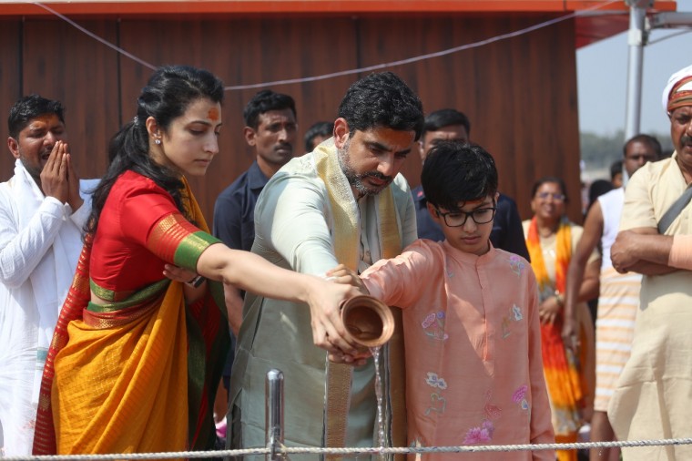 నారా లోకేశ్, ఆయన అర్ధాంగి నారా బ్రాహ్మణి, తనయుడు నారా దేవాన్ష్ నేడు ఉత్తరప్రదేశ్ ప్రయాగరాజ్ లో జరుగుతున్న మహా కుంభమేళాకు హాజరయ్యారు. త్రివేణి సంగమం వద్ద షాహి స్నానఘట్టంలో పవిత్ర స్నానాలు ఆచరించారు. సంప్రదాయబద్ధంగా గంగాదేవికి పూజలు చేసి, హారతి ఇచ్చారు. దీనిపై నారా బ్రాహ్మణి సోషల్ మీడియా వేదికగా స్పందించారు. మహా కుంభమేళా-2025లో పాల్గొనడం జీవితకాలపు అనుభూతి అని అభివర్ణించారు. ప్రయాగరాజ్ లో పవిత్ర స్నానం ఆచరించామని వెల్లడించారు. ఈ మహిమాన్విత గడ్డపైకి తరలివచ్చిన కోట్లాది మంది సామూహిక విశ్వాసాల నుంచి తాను అద్భుతమైన దివ్య శక్తిని అనుభూతి చెందానని నారా బ్రాహ్మణి వివరించారు. ఈ మేరకు తమ కుంభమేళా పర్యటన ఫొటోలను కూడా ఆమె పంచుకున్నారు.
