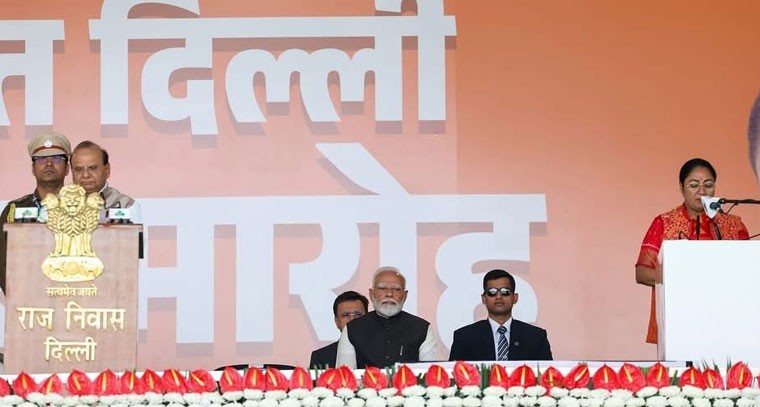 దేశ రాజధాని ఢిల్లీలో కొత్త ప్రభుత్వం కొలువుదీరింది. గురువారం మధ్యాహ్నం రామ్లీలా మైదానంలో జరిగిన కార్యక్రమంలో ఢిల్లీ ముఖ్యమంత్రిగా రేఖాగుప్తా ప్రమాణస్వీకారం చేశారు.లెఫ్టినెంట్ గవర్నర్ వీకే సక్సేనా ఆమెతో ప్రమాణం చేయించారు. 27 ఏళ్ల తర్వాత ఢిల్లీలో అధికారాన్ని దక్కించుకున్న బీజేపీ.. ఈ కార్యక్రమాన్ని అట్టహాసంగా నిర్వహించింది. ఈ కార్యక్రమానికి ప్రధానమంత్రి నరేంద్రమోడీ, పలువురు కేంద్రమంత్రులు, ఎన్డీయే పాలిత రాష్ట్రాల ముఖ్యమంత్రులు, బీజేపీ అగ్రనేతలు హాజరయ్యారు. ఆంధ్రప్రదేశ్ సీఎం చంద్రబాబు, డిప్యూటీ సీఎం పవన్కల్యాణ్ పాల్గొన్నారు.