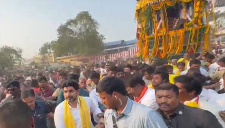 ఆంధ్రప్రదేశ్ మంత్రి నారా లోకేశ్ మంగళగిరిలో జరిగిన శివరాత్రి వేడుకల్లో భక్తులతో కలిసి స్వామివారి రథాన్ని లాగారు. గుంటూరు జిల్లాలోని మంగళగిరిలో శివరాత్రి వేడుకలు వైభవంగా జరిగాయి. శ్రీ గంగాభ్రమరాంబ సమేత మల్లేశ్వరస్వామి దేవస్థానం ఆధ్వర్యంలో శివరాత్రి వేడుకలను నిర్వహించారు.ఇక్కడ జరిగిన రథోత్సవంలో మంత్రి నారా లోకేశ్ పాల్గొన్నారు. ఆలయ ప్రాంగణానికి చేరుకున్న మంత్రికి నిర్వాహకులు ఘన స్వాగతం పలికారు. స్వామి వారి రథం వద్ద మంత్రి ప్రత్యేక పూజలు నిర్వహించి, ఆ తర్వాత భక్తులతో కలిసి 200 మీటర్ల దూరం రథాన్ని లాగారు.శివరాత్రి వేడుకల్లో భాగంగా మంగళగిరిలోని శ్రీ గంగా భ్రమరాంబ సమేత మల్లేశ్వర స్వామి వార్ల దేవస్థానం ఆధ్వర్యంలో నిర్వహించిన రథోత్సవంలో పాల్గొన్నానని లోకేశ్ 'ఎక్స్' వేదికగా ట్వీట్ చేశారు. భక్తుల శివనామ స్మరణ, అశేష జనసందోహం మధ్య రథాన్ని లాగానని పేర్కొన్నారు. దేవస్థానం ఆధ్వర్యంలో ఏర్పాటు చేసిన సాంస్కృతిక కార్యక్రమాలు ఆకట్టుకున్నాయని తెలిపారు.అనంతరం కృష్ణాయపాలెంలోని అన్నపూర్ణ సమేత శ్రీ విశ్వేశ్వర స్వామి దేవస్థానం వార్షిక బ్రహ్మోత్సవంలో పాల్గొన్నానని తెలిపారు. విశ్వేశ్వరస్వామి వారిని దర్శించుకుని ప్రత్యేక పూజలు చేసినట్లు తెలిపారు. వేద పండితులు తనకు ఆశీర్వచనాలు అందించారని, స్థానికులతో కలిసి ఫోటోలు దిగానని పేర్కొన్నారు.