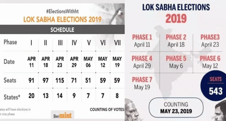 దేశంలో 7 ఫేజుల్లో సార్వత్రిక ఎన్నికల షెడ్యూల్ను విడుదల చేసింది కేంద్ర ఎన్నికల కమిషన్. ఏప్రిల్ 11న రెండు తెలుగు రాష్ట్రాల్లో ఎన్నికలు జరగనున్నాయి. దేశంలోని వివిధ రాష్ట్రాల నియోజకవర్గాల సంఖ్య, రాష్ట్రాల్లోని పరిస్థితులను బట్టి ఏడు దశల్లో ఎన్నికలు నిర్వహించనున్నారు. ఏయే రాష్ట్రాల్లో ఏయే దశలలో, ఎన్ని నియోజకవర్గాలకు పోలింగ్ జరుగుతుందో క్రింది విధంగా వున్నాయి. ఆంధ్రప్రదేశ్, అరుణాచల్ ప్రదేశ్, సిక్కిం, ఒడిశా రాష్ట్ర అసెంబ్లీలకు కూడా అదే సమయంలో ఎన్నికలు జరుగుతాయి.