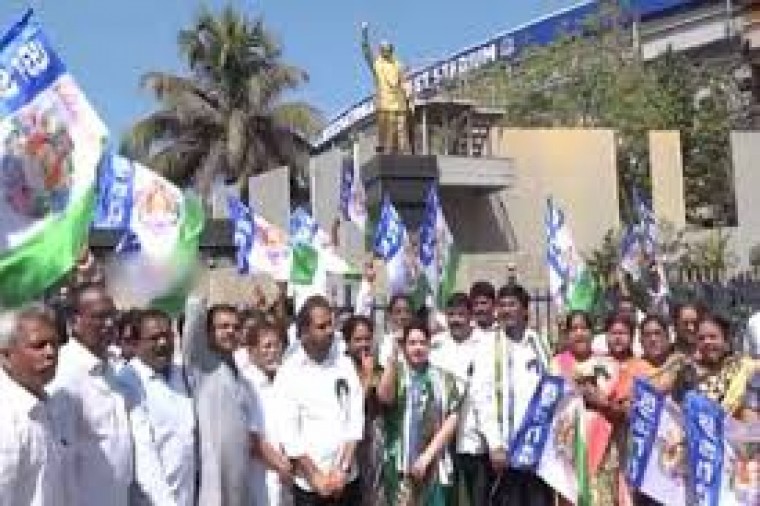 విశాఖపట్నం అంతర్జాతీయ క్రికెట్ స్టేడియంకు వైఎస్ఆర్ పేరు తొలగించడం పట్ల నిరసన వ్యక్తం చేస్తూ వైసీపీ నేతలు ఆందోళనకు దిగారు. ప్రస్తుతం జరుగుతున్న ఏపీ అసెంబ్లీ సమావేశాల్లో భాగంగా కూటమి ప్రభుత్వం వైఎస్ఆర్ జిల్లా పేరును వైఎస్ఆర్ కడప జిల్లాగా తాడిగడప మున్సిపాలిటీకి, వైజాగ్ క్రికెట్ స్టేడియానికి వైఎస్ఆర్ పేరును తొలిగిస్తూ నిర్ణయం తీసుకుంది. ఈ నేపథ్యంలో కూటమి ప్రభుత్వంపై వైసీసీ నేతలు విమర్శలు గుప్పిస్తున్నారు. విశాఖ క్రికెట్ స్టేడియానికి వైఎస్ఆర్ పేరును తొలగించడంపై ఈరోజు వైసీపీ నేతలు ఆందోళనకు పిలుపునిచ్చారు. ఈ నిరసనల్లో భాగంగా ఆ పార్టీ కార్యకర్తలు, నేతలు మధురవాడలోని క్రికెట్ స్టేడియంకు చేరుకుని వైఎస్ఆర్ విగ్రహం ముందు నిరసనకు దిగారు. స్టేడియానికి తిరిగి వైఎస్ఆర్ పేరును జోడించాలని వారు డిమాండ్ చేస్తున్నారు. లేనిపక్షంలో రాష్ట్రవ్యాప్తంగా నిరసనలను ఉద్ధృతం చేస్తామంటున్నారు. ఇక ఈ స్టేడియంలో మార్చి 24, 30 తేదీలలో ఐపీఎల్ మ్యాచ్లు ఉన్న విషయం తెలిసిందే. దీంతో స్టేడియం వద్ద పోలీసులు భారీ బందోబస్తు ఏర్పాటు చేశారు.