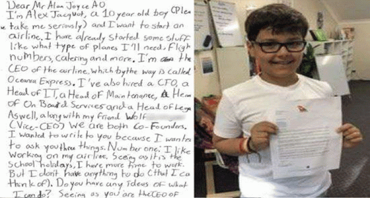 ఆస్ట్రేలియాకు చెందిన ఈ కుర్రాడి పేరు అలెక్స్ జాక్వట్. పది సంవత్సరాల వయసులోనే సొంతంగా ఎయిర్లైన్స్ సంస్థ స్థాపించాలనే కుతూహలం కలిగింది. ఒక అంతర్జాతీయ ఎయిర్లైన్స్కి సీఈవోగా ఉండాలని అనుకున్నాడు. నెట్లో్ చాలా సమాచారం సంపాదించాడు. అయినా కొన్నింటికి సమాధానాలు తెలియరాలేదు. వాటిని తెలుసుకోవడం కోసం ఆస్ట్రేలియాలోనే అతిపెద్ద ఎయిర్లైన్స్గా పేరుగాంచిన 'క్వాంటాస్' సీఈవో అలెన్ జోస్కు ఆ ప్రశ్నలన్నిటినీ పెన్సిల్తో ఒక కాగితంపై రాసి పంపించాడు. నేను చెబుతున్నవన్నీ సీరియస్గా తీసుకోవాలని లేఖ మొదట్లోనే రాశాడు.'ఇప్పుడు నాకు పాఠశాల సెలవులు. నా దగ్గర చాలా సమయం ఉంది. అందుకే ఓషనియా ఎక్స్ప్రెస్ పేరుతో అంతర్జాతీయ ఎయిర్లైన్స్ నడపాలనుకుంటున్నాను(నేను చెప్పేవన్నీ సీరియస్గా తీసుకోండి). దాన్ని ఎలా ప్రారంభించాలి? దానికి నేనే సీఈవో. నా మిత్రుడు వైస్ సీఈవోగా ఉంటాడు. ముందుగా సిడ్నీ నుంచి లండన్కు నాన్స్టాప్ సర్వీస్లు నడపాలనుకుంటున్నాను. అయితే విమానం దాదాపు 25 గంటలు ఆగకుండా ప్రయాణం చేయాలి. నా విమానాల్లో ప్రయాణిస్తున్నవారెవ్వరూ ఇబ్బంది పడకూడదు. వారు నిద్రపోయేందుకు వీలుగా విమానంలో ఏర్పాట్లు చేయాలి. ఇవన్నీ సాధ్యం కావడానికి మీ దగ్గర ఏవైనా సలహాలున్నాయా? ఉంటే చెప్పండి' అని లేఖలో క్వాంటాస్ సీఈవోను కోరాడు.