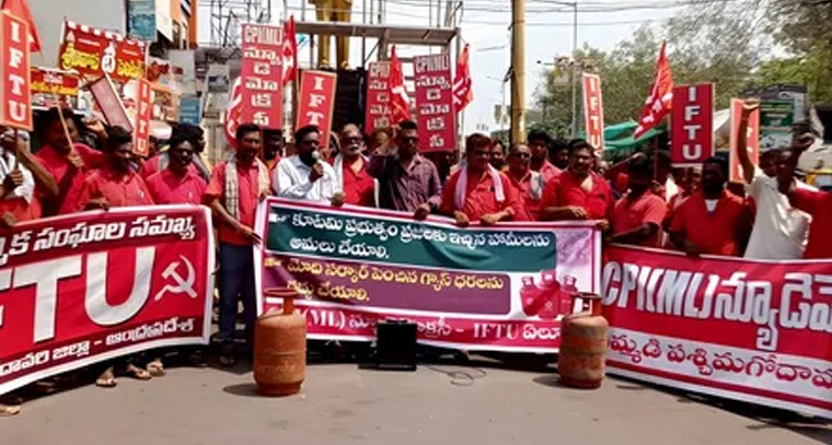 కేంద్రంలో మోడీషా సర్కార్ పెంచిన డీజిల్, పెట్రోల్ గ్యాస్ ధరలను రద్దు చేయాలని కోరుతూ.. ఏలూరులో సిపిఐ (ఎంఎల్) న్యూ డెమోక్రసీ పార్టీ, ఐఎఫ్టియు కార్మిక సంఘం ఆధ్వర్యంలో నిరసన చేపట్టారు. ఈ సందర్భంగా పలువురు నాయకులు మాట్లాడుతూ.. ప్రపంచంలో ముడుసమురు ధరలు పెరగకపోయినా అమాంతంగా ధరలు పెంచి ప్రజల ఆర్థిక వ్యవస్థను మరింత కుదేలయ్యే విధంగా ప్రజలపై పెనుభారం మోపుతూ గ్యాస్, పెట్రోల్, డీజిల్ ధరలను పెంచడం అన్యాయమన్నారు.
