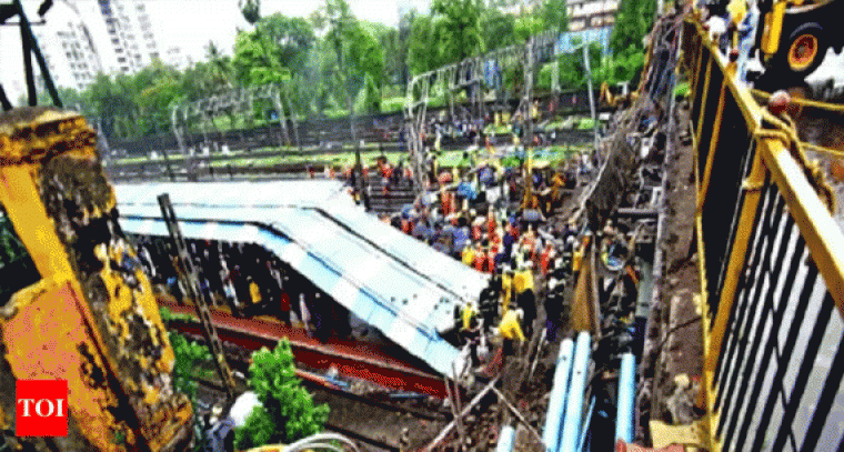 ముంబాయి ఛత్రపతి శివాజీ మహారాజ్ టర్మినల్ (సీఎస్టీ) సమీపంలోని ఓ పుట్ ఓవర్ బ్రిడ్జి ఆకస్మాత్తుగా కూలిన సంఘటనలో నలుగురు మృతి చెందగా 35 మందికి గాయాలయ్యాయి. సీఎస్టీ ప్లాట్పామ్-1కు వెళ్లే పాదాచారుల వంతెన ఒక్కసారిగా రాత్రి కుప్పకూలింది. ఈ దుర్ఘటనలో అక్కడిక్కడే నలుగురు మృతి చెందారు. వంతెన కుప్పకూలడంతో ప్రయాణికులు భయభ్రాంతులకు గురై పరుగులు తీశారు. క్షతగాత్రులను హుటాహుటిన సమీపంలోని ఆసుపత్రులకు తరలించారు. శిథిలాల కింద మరికొందరు చిక్కుకుని ఉంటారని భావిస్తున్నారు. సహాయక కార్యక్రమాలు కొనసాగుతున్నాయి.