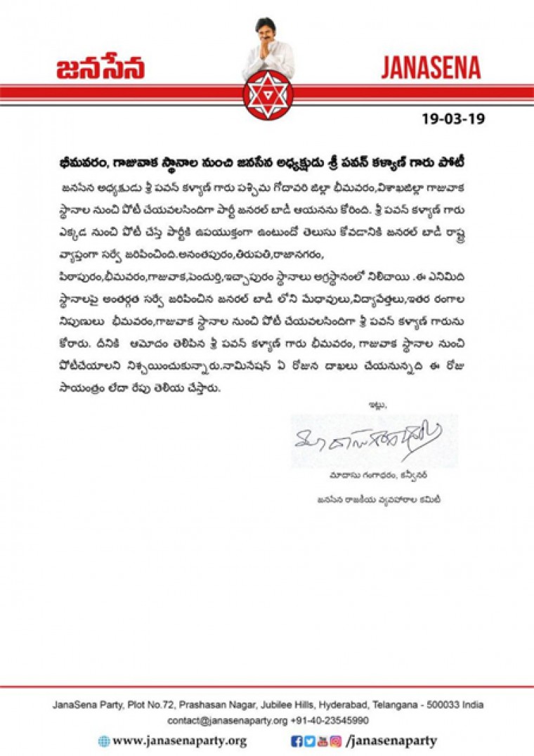 జనసేన అధ్యక్షుడు పవన్ కళ్యాణ్ ఎపి అసెంబ్లీ ఎన్నికలలో రెండు స్థానాల నుంచి పోటీ చేయనున్నారు.. విశాఖ జిల్లా గాజువాక, పశ్చిమ గోదావరి జిల్లా భీమవరం నుంచి ఆయన బరిలోకి దిగుతున్నారు. ఈ మేరకు జనసేన పార్టీ అధికారికంగా ఒక ప్రకటన విడుదల చేసింది.