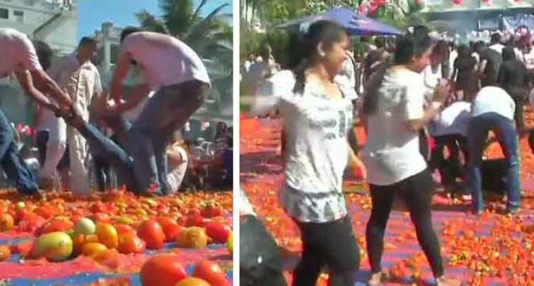 గుజరాత్లోని అహ్మదాబాద్లో యువత హోళీ పండుగను వినూత్నంగా జరుపుకొన్నారు. హోళీ రోజున రకరకాల రంగులు జల్లుకుంటూ వేడుకలు నిర్వహించుకోవడం సాధారణం. అయితే దీనికి భిన్నంగా వారు టమాటాలతో హోళీ వేడుకలు నిర్వహించుకున్నారు. రసాయనాలతో చేసిన రంగుల కంటే, ప్రకృతి సహజమైన రంగులుండే టమాటాలను రంగులు చల్లుకోవడానికి ఎంచుకున్నారు. రోడ్డంతా కిలోల కొద్దీ టమాటాలను పోసి వాటి రసాన్ని ఒకరిపై ఒకరు చిమ్ముకున్నారు.
