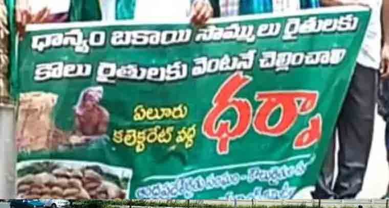 రైతులకు ధాన్యం బకాయిలు చెల్లించాలని డిమాండ్ చేస్తూ ఆంధ్రప్రదేశ్ రైతు సంఘం, కౌలు రైతు సంఘాల ఆధ్వర్యంలో సోమవారం విజయవాడలోని పౌరసరఫరాల శాఖ ప్రధాన కార్యాలయం వద్ద రైతులు ధర్నా నిర్వహించారు. అనంతరం సివిల్ సప్లయిస్ కమిషనర్ సౌరభ్ గౌర్, సివిల్ సప్లయిస్ కార్పొరేషన్ ఎండీ మనజీర్ జిలానీ సమూన్లను కలసి వినతిపత్రాలు అందజేశారు. వారం రోజుల్లో రైతుల ఖాతాల్లో డబ్బులు జమ చేస్తామని అధికారులు హామీ ఇచ్చారని రైతు సంఘాల ప్రతినిధులు తెలిపారు.