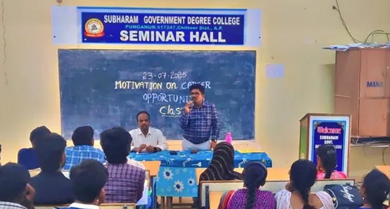 పుంగునూరు పట్టణంలోని శుభారాం ప్రభుత్వ డిగ్రీ కళాశాలలో బుధవారం విద్యార్థులకు మోటివేషనల్ తరగతులను ప్రిన్సిపల్ డాక్టర్ శ్రీనివాస్ ఆధ్వర్యంలో నిర్వహించారు. ఈ కార్యక్రమానికి ముఖ్య అతిథిగా విచ్చేసిన ఎన్. ఎస్. పేట ఉర్దూ పాఠశాల ఉపాధ్యాయులు రాజేంద్రన్ మాట్లాడుతూ విద్యార్థులకు చదివే ఒక ఆభరణమని అదేవిధంగా విద్యార్థులకు ఎదురయ్యే సమస్యలను ఏ విధంగా ఎదుర్కొని ముందుకు వెళ్లి విజయం సాధించాలి అనే విషయాలను తెలిపారు.