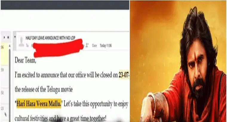 ట్విట్టర్ అదే ఇప్పటి ఎక్స్లో యాక్టీవ్గా ఉండే వారికి బాలు రెడ్డి యూకే అనే వ్యక్తి చిరపరిచతమే. ఇతడు మెగా హీరోలకు అందునా పవన్ కళ్యాణ్కు వీరాభిమాని. అతడి పోస్ట్లు చూస్తే ఈ విషయం స్పష్టంగా అర్థం అవుతుంది. యూకేలో ఒక ఐటీ కంపెనీ, ఈకామర్స్ బిజినెస్ రన్ చేస్తున్నారు. ఈక్రమంలో తాజాగా అతడు తన కంపెనీలో పని చేసే ఉద్యోగులకు శుభవార్త చెప్పారు. హరి హర వీరమల్లు సినిమా రిలీజ్ సందర్బంగా ఉద్యోగులకు హాఫ్ డే సెలవు ఇస్తున్నట్లుగా మెయిల్ చేశారు. దీనికి సంబంధించిన స్క్రీన్ షాట్ని ఎక్స్లో పోస్ట్ చేశారు.