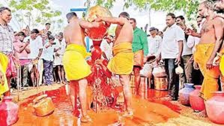 తమిళనాడులోని ధర్మపూరి జిల్లాలో ఓ వింత ఆచారం కొనసాగుతోంది. పూజారికి కారం నీళ్లతో అభిషేకం చేయడం. అవును మీరు విన్నది నిజమే. అక్కడి పెరియకరుప్పు ఆలయంలో ఈ ఆచారం ఉంది. యేటా ఆడి అమావాస్య సందర్భంగా ఆలయ పూజారికి ఇలా కారం, పచ్చి మిరపకాయలు కలిపిన నీళ్లతో అభిషేకించడం జరుగుతుంది.గురువారం ఆడి అమావాస్య రావడంతో 108 కిలోల కారం, ఆరు కిలోల పచ్చి మిరపకాయలు కలిపిన నీళ్లతో పూజారి గోవింద్కు అభిషేకం చేశారు. ఈ ప్రత్యేక అభిషేకంలో పెద్ద సంఖ్యలో పాల్గొన్న భక్తులు మొక్కులు చెల్లించుకున్నారు. అలాగే భక్తులకు ఆలయ ప్రాంగణంలో మాంసాహార విందు ఏర్పాటు చేశారు.