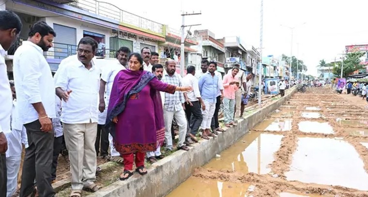 సత్యసాయి జిల్లా పెనుకొండ నియోజకవర్గం గోరంట్ల మండల కేంద్రంలో సింగిరెడ్డిపల్లి క్రాస్ నుండి బస్టాండ్ వరకు 80 లక్షల రూపాయల నిధులతో నిర్మాణం జరుగుతున్న సీసీ రోడ్డు పనులని స్థానిక నాయకులు కార్యకర్తలతో కలసి రాష్ట్ర బీసీ సంక్షేమ చేనేత జౌళి శాఖల మంత్రి సవిత సోమవారం పరిశీలించారు. ఈ సందర్భంగా మంత్రి రోడ్డు నిర్మాణ పనులను త్వరితగతిన పూర్తిచేయాలని అధికారులను ఆదేశించారు.