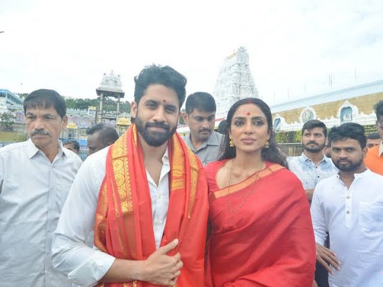 టాలీవుడ్ యంగ్ కపుల్ నాగచైతన్య, శోభితా ధూళిపాళ్ల గురువారం ఉదయం తిరుమల వెంకటేశ్వర స్వామిని దర్శించుకున్నారు. కెరీర్ లో ఎంతో బిజీగా ఉన్నప్పటికీ, నాగచైతన్య తన అర్ధాంగితో కలిసి స్వామివారి ఆశీస్సులు పొందేందుకు తిరుమలకు విచ్చేశారు. వీరి పర్యటనకు సంబంధించిన ఫోటోలు, వీడియోలు ప్రస్తుతం సామాజిక మాధ్యమాల్లో విస్తృతంగా ప్రచారమవుతున్నాయి.గురువారం ఉదయం ఆలయానికి చేరుకున్న చైతన్య, శోభిత స్వామివారికి ప్రత్యేక పూజలు నిర్వహించారు. ఈ సందర్భంగా నాగచైతన్య సంప్రదాయ పట్టు పంచెలో కనిపించగా, శోభిత ఎరుపు, బంగారు వర్ణం కలగలిపిన పట్టు చీరలో ఆకట్టుకున్నారు. దర్శనానంతరం ఆలయ అధికారులు ఈ జంటకు స్వామివారి ప్రతిమను బహూకరించారు. ఈ సమయంలో వారు నవ్వుతూ ఫోటోలకు ఫోజులిచ్చారు.ఆలయం నుంచి బయటకు వస్తున్న క్రమంలో అభిమానులు, మీడియా ప్రతినిధుల రద్దీ మధ్య నాగచైతన్య తన భార్య శోభిత చేతిని పట్టుకుని జాగ్రత్తగా ముందుకు నడిపించారు. ఆమె పట్ల చైతన్య చూపిన ఈ ఆప్యాయత అందరి దృష్టిని ఆకర్షించింది. ఈ దృశ్యాలు వైరల్ కావడంతో, అభిమానులు వీరిని 'అద్భుత జంట' అంటూ ప్రశంసిస్తున్నారు.కొంతకాలంగా ప్రేమలో ఉన్న నాగచైతన్య, శోభిత గత ఏడాది ఆగస్టులో హైదరాబాద్లో నిశ్చితార్థం చేసుకున్నారు. అనంతరం డిసెంబర్లో అన్నపూర్ణ స్టూడియోస్ వేదికగా కుటుంబ సభ్యులు, అత్యంత సన్నిహితుల సమక్షంలో వీరి వివాహం జరిగింది. 2021లో సమంతతో విడిపోయిన తర్వాత, 2022 నుంచి చైతూ, శోభిత మధ్య ప్రేమాయణంపై వార్తలు వస్తున్న విషయం తెలిసిందే.