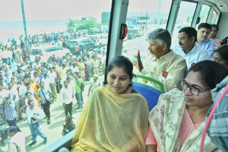 పర్యాటక కేంద్రమైన విశాఖపట్నంలో సందర్శకులకు సరికొత్త అనుభూతిని అందించేందుకు 'హాప్ ఆన్ హాప్ ఆఫ్' డబుల్ డెక్కర్ బస్సులు అందుబాటులోకి వచ్చాయి. బీచ్ రోడ్డులో ఏర్పాటు చేసిన ఈ రెండు బస్సులను ముఖ్యమంత్రి నారా చంద్రబాబు నాయుడు నిన్న జెండా ఊపి లాంఛనంగా ప్రారంభించారు. ఈ సందర్భంగా పర్యాటకులకు ఆయన ఓ శుభవార్త అందించారు. బస్సు టికెట్ ధరను అక్కడికక్కడే సగానికి తగ్గిస్తున్నట్లు ప్రకటించి అందరినీ ఆశ్చర్యపరిచారు.పర్యాటక శాఖ ఆధ్వర్యంలో జరిగిన ఈ కార్యక్రమంలో 24 గంటల పాటు ప్రయాణించేందుకు వీలుగా టికెట్ ధరను అధికారులు రూ. 500గా నిర్ణయించారు. ఈ విషయం తెలుసుకున్న ముఖ్యమంత్రి చంద్రబాబు వెంటనే స్పందిస్తూ పర్యాటకులపై భారం తగ్గించే ఉద్దేశంతో ధరను సగానికి తగ్గిస్తున్నట్లు వెల్లడించారు. మిగిలిన సగం మొత్తాన్ని ప్రభుత్వమే భరిస్తుందని స్పష్టం చేశారు. దీంతో పర్యాటకులు కేవలం రూ. 250తో రోజంతా డబుల్ డెక్కర్ బస్సులో ప్రయాణించవచ్చు.అనంతరం చంద్రబాబు మాట్లాడుతూ.. 'నారి' సర్వేలో మహిళలకు అత్యంత సురక్షిత నగరంగా విశాఖ ఎంపిక కావడం సంతోషకరమని అన్నారు. కార్యక్రమం ముగిసిన తర్వాత మంత్రులు కందుల దుర్గేష్, అనిత, డోలా శ్రీబాల వీరాంజనేయస్వామి, ఎంపీ శ్రీభరత్, ఎమ్మెల్యేలు పల్లా శ్రీనివాసరావు, వెలగపూడి రామకృష్ణబాబు, విష్ణుకుమార్ రాజు, కలెక్టర్ హరేంధిర ప్రసాద్తో కలిసి ఆయన బస్సులో పార్క్ హోటల్ వరకు ప్రయాణించారు. ప్రయాణంలో దారిపొడవునా ప్రజలకు చంద్రబాబు అభివాదం చేస్తూ కొందరిని తన పక్కన కూర్చోబెట్టుకుని ఆప్యాయంగా ముచ్చటించారు.