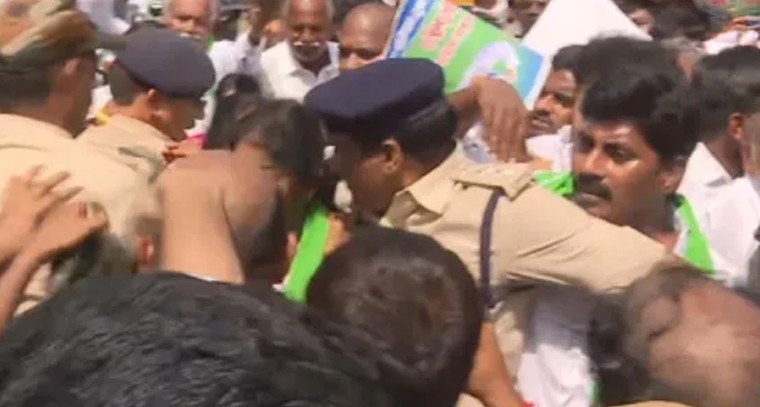 AP: ఎన్టీఆర్ జిల్లాలో ఉద్రిక్తత నెలకొంది. రైతులతో కలిసి నందిగామలో జరిగే అన్నదాత పోరు కార్యక్రమానికి వైసీపీ నేతలు బయలుదేరారు. గంపలగూడెం మండలం రాజవరం గ్రామ శివారులో వైసీపీ నేతల వాహనాలను అడ్డుకున్నారు. పోలీసుల తీరును వ్యతిరేకిస్తూ వైసీపీ నేతలు రోడ్డుపై బైఠాయించాయి. కూటమి ప్రభుత్వానికి వ్యతిరేకంగా నినాదాలు చేశారు. ఈ క్రమంలో పోలీసులు, వైసీపీ నేతల మధ్య తోపులాట చోటు చేసుకుంది. పూర్తి వివరాలు తెలియాల్సి ఉంది.