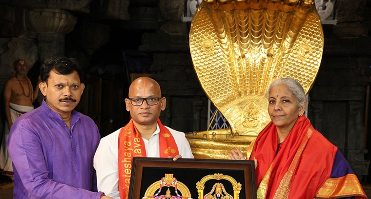 కేంద్ర ఆర్థిక మంత్రి నిర్మలా సీతారామన్ శుక్రవారం వేకువజామున తిరుమల శ్రీవారిని దర్శించుకున్నారు. అభిషేక సేవతో పాటు వీఐపీ ప్రారంభ విరామ దర్శనంలో కూడా ఆమె పాల్గొన్నారు. టీటీడీ అదనపు ఈవో వెంకయ్య చౌదరి ఆమెకు స్వాగతం పలికారు. దర్శన అనంతరం కుటుంబ సభ్యులతో కలిసి స్వామివారిని దర్శించిన ఆమెకు రంగనాయకుల మండపంలో పండితులు వేద ఆశీర్వచనంతో పాటు తీర్థప్రసాదాలను అందజేశారు.