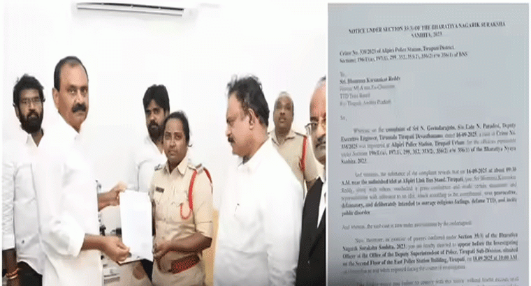 తిరుపతిలోని అలిపిరి ఓల్డ్ చెక్ పాయింట్ వద్ద విగ్రహం వ్యవహారం ఏపీలో రాజకీయ కాకకు కారణమవుతోంది. దీనిపై అధికార. విపక్ష నేతల మధ్య ఆరోపణలు, ప్రత్యారోపణలు చోటుచేసుకుంటున్నాయి. ఈ క్రమంలోనే వైసీపీ నేత, టీటీడీ మాజీ ఛైర్మన్ భూమన కరుణాకర్ రెడ్డి కి పోలీసులు నోటీసులు జారీ చేశారు. విగ్రహాన్ని నిర్లక్ష్యంగా వదిలేశారంటూ భూమన చేసిన వ్యాఖ్యలపై ఆయన మీద కేసు నమోదైంది. ఈ నేపథ్యంలోనే అలిపిరి పోలీసులు భూమన కరుణాకర్ రెడ్డికి 41ఏ నోటీసులు ఇచ్చారు. గురువారం రోజున తిరుపతి డీఎస్పీ కార్యాలయంలో విచారణకు హాజరు కావాలంటూ భూమన కరుణాకర్ రెడ్డికి నోటీసులు అందించారు. అయితే తనకు కొన్ని రోజులు పనులు ఉన్నాయని.. సెప్టెంబర్ 23వ తేదీన విచారణకు వస్తానని భూమన కరుణాకర్ రెడ్డి పోలీసులకు చెప్పినట్లు తెలిసింది.