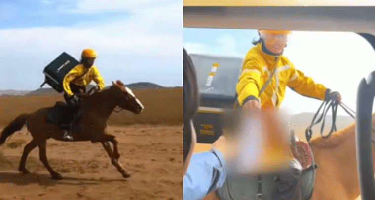 చైనాలో ఒక డెలివరీ బాయ్ గుర్రంపై ఫుడ్ డెలివరీ చేస్తున్న వీడియో ప్రస్తుతం సోషల్ మీడియాలో వైరల్గా మారింది. విస్తారమైన గడ్డి మైదానాల్లో పర్యాటకులకు ఆహారం అందించేందుకు, బైక్ లేదా సైకిల్తో వెళ్లడం సాధ్యం కాకపోవడంతో అతను ఈ వినూత్న మార్గాన్ని ఎంచుకున్నాడు.ఆ వీడియోలో డెలివరీ బాయ్ గుర్రంపై స్వారీ చేస్తూ, ఆర్డర్ చేసిన ఫుడ్ను పర్యాటకులకు అందిస్తున్న దృశ్యాలు కనిపిస్తాయి. కొన్ని సందర్భాల్లో, అతను కార్లలో ప్రయాణిస్తున్న వారికీ ఆహారాన్ని అందిస్తున్నట్లు కూడా చూడవచ్చు. ఈ దృశ్యం చూసి నెటిజన్లు ఆశ్చర్యపోతూ, ఆ డెలివరీ బాయ్ దృఢ సంకల్పాన్ని ప్రశంసిస్తున్నారు.ప్రస్తుతం ఆన్లైన్ ఫుడ్ ఆర్డర్లు విపరీతంగా పెరిగాయి. సాధారణంగా డెలివరీ బాయ్లు బైక్లు లేదా సైకిళ్లను ఉపయోగిస్తారు. అయితే, ఈ యువకుడు మాత్రం వాహనాలకు బదులుగా గుర్రాన్ని ఎంచుకోవడం ద్వారా అందరినీ ఆకట్టుకున్నాడు. తన బాధ్యతను నిబద్ధతగా నిర్వర్తించిన ఈ సృజనాత్మక డెలివరీ బాయ్ వీడియో ఇప్పుడు వైరల్ సెన్సేషన్గా మారింది.ఈ వీడియోను CGTN అనే ఇన్స్టాగ్రామ్ ఖాతా షేర్ చేసింది. చైనాలోని ఇన్నర్ మంగోలియా ప్రాంతంలో చోటుచేసుకున్న ఈ సంఘటన స్థానిక సంస్కృతిని కూడా ప్రతిబింబిస్తోంది. విస్తారమైన గడ్డి భూములు, గ్రామీణ జీవన విధానంలో గుర్రపు స్వారీకి ఉన్న ప్రాధాన్యత అక్కడి ప్రజల జీవనశైలిలో భాగంగా ఉంటుంది.ఈ డెలివరీ బాయ్ చేసిన పని కేవలం తన వృత్తిపట్ల అంకితభావాన్నే కాకుండా, ఇన్నర్ మంగోలియా గుర్రపు వారసత్వాన్ని ప్రపంచానికి పరిచయం చేసింది. అదే సమయంలో, చైనాలో వేగంగా అభివృద్ధి చెందుతున్న ఫుడ్ డెలివరీ పరిశ్రమలో వినూత్నతకు ఇది ఒక అద్భుత ఉదాహరణగా నిలిచింది.