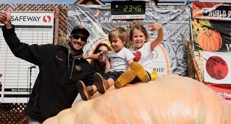 అమెరికాలోని సాంట రోసాకు చెందిన ఇంజినీర్ బ్రాండన్ డ్వాసన్ భారీ గుమ్మడికాయను పండించారు. ఆ గుమ్మడికాయ బరువు అక్షరాలా 1,064 కిలోలు. దీన్ని కాలిఫోర్నియాలో జరిగిన పోటీల్లో ప్రదర్శించి డ్వాసన్ విజేతగా నిలిచారు. గత ఏడాది 3 కిలోలు తక్కువ బరువుతో గెలుపు రాకపోవడంతో తీవ్ర ఆవేదన చెందారట. ఈ సారి గెలవడంతో ఆనందం వ్యక్తం చేశారు. ఐదేళ్లుగా భారీ గుమ్మడికాయలు పండిస్తున్న డ్వాసన్, ఈ విజయంలో భాగంగా 20 వేల డాలర్లు బహుమతిగా పొందారు