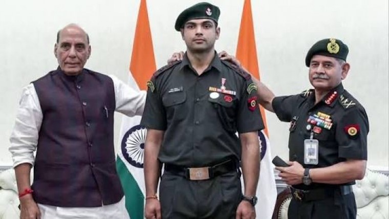 భారత జావెలిన్ సంచలనం, రెండుసార్లు ఒలింపిక్ పతకాల విజేత నీరజ్ చోప్రా ఖాతాలో మరో అరుదైన గౌరవం చేరింది. ఆయనకు భారత ప్రాదేశిక సైన్యంలో గౌరవ లెఫ్టినెంట్ కల్నల్ హోదాను ప్రదానం చేశారు. ఢిల్లీలోని సౌత్ బ్లాక్లో ఈరోజు జరిగిన ఓ కార్యక్రమంలో రక్షణ శాఖ మంత్రి రాజ్నాథ్ సింగ్ ఈ లాంఛనాన్ని పూర్తి చేసి, నీరజ్ భుజంపై గౌరవ చిహ్నాలను అలంకరించారు.ఈ సందర్భంగా రాజ్నాథ్ సింగ్ మాట్లాడుతూ నీరజ్ చోప్రా పట్టుదల, దేశభక్తి, నిబద్ధతకు నిలువుటద్దం వంటి వారని కొనియాడారు. క్రీడారంగంలో ఆయన సాధించిన అద్భుత విజయాలు దేశానికి గర్వకారణమని, ఆయన క్రీడాకారులకు, సైనిక దళాలకు ఒకేలా స్ఫూర్తిగా నిలుస్తారని అన్నారు. ఈ కార్యక్రమానికి ఆర్మీ చీఫ్ జనరల్ ఉపేంద్ర ద్వివేది, ఇతర ఉన్నతాధికారులు, నీరజ్ కుటుంబ సభ్యులు హాజరయ్యారు.నీరజ్ చోప్రా 2016 ఆగస్టు 26న రాజ్పుతానా రైఫిల్స్లో నాయబ్ సుబేదార్గా భారత సైన్యంలో చేరారు. అప్పటి నుంచి క్రీడల్లో రాణిస్తూనే దేశానికి సేవ చేస్తున్నారు. టోక్యో ఒలింపిక్స్లో స్వర్ణం సాధించి చరిత్ర సృష్టించిన ఆయన, 2024 పారిస్ ఒలింపిక్స్లో రజతం గెలుచుకున్నారు. ప్రపంచ అథ్లెటిక్స్ ఛాంపియన్షిప్, ఆసియా క్రీడలు, కామన్వెల్త్ గేమ్స్లోనూ ఆయన స్వర్ణ పతకాలు సాధించారు.దేశానికి ఆయన అందించిన సేవలు, క్రీడల్లో సాధించిన విజయాలకు గుర్తింపుగా.. నీరజ్ చోప్రాకు ఈ గౌరవ హోదాను రాష్ట్రపతి ద్రౌపది ముర్ము ఈ ఏడాది ఏప్రిల్ 16నే ఆమోదించారు. దీనికి సంబంధించిన అధికారిక కార్యక్రమాన్ని ఈరోజు నిర్వహించారు. నీరజ్ చోప్రా ఇప్పటికే పద్మశ్రీ, మేజర్ ధ్యాన్ చంద్ ఖేల్ రత్న, అర్జున అవార్డులతో పాటు పరమ విశిష్ట సేవా పతకం, విశిష్ట సేవా పతకం వంటి సైనిక పురస్కారాలను కూడా అందుకున్నారు.