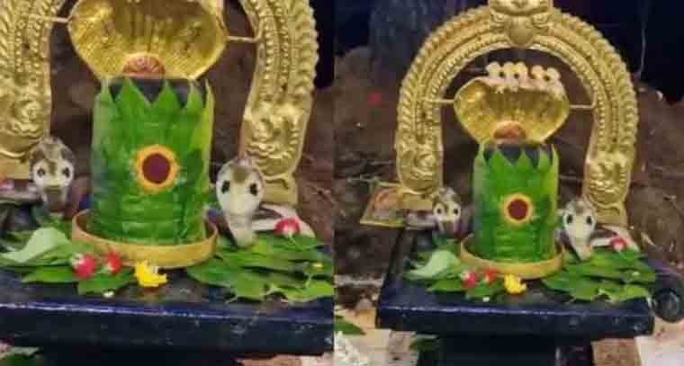 నాగుల చవితి నాడు అరుదైన దృశ్యం అగుపించింది. పర్వదిన వేళ రెండు నాగు పాములు ఒకేసారి శివలింగాన్ని చుట్టుకొని భక్తులను ఆశ్చర్యపరిచాయి. శ్రీ పొట్టిశ్రీరాములు నెల్లూరు జిల్లా చెర్లోపల్లి రైల్వేగేట్ వద్ద ఉన్న విశ్వనాథ స్వామి ఆలయంలో ఈ వింత చోటుచేసుకుంది. దీని గురించి ఆలయ అర్చకులు శ్రీనివాసులు వివరణ ఇచ్చారు. నాగుల చవితి సందర్భంగా ఏటా సుబ్రహ్మణ్యేశ్వర స్వామి హోమం, అభిషేకాలను నిర్వహిస్తామని, ఈ నేపథ్యంలో శుక్రవారం రాత్రి అక్కడే నిద్రించామని చెప్పారు.ఈ క్రమంలో అర్ధరాత్రి దాటాక దాదాపు 3 గంటల సమయంలో నాగుపాములు బుసలు కొడుతూ శివలింగం చుట్టూ ప్రదక్షిణలు చేస్తూ కనిపించాయని వెల్లడించారు . కొంచెంసేపటి తర్వాత వెనుక ఉన్న పుట్టలోకి రెండు నాగు పాములు వెళ్లిపోయినట్లు అర్చకుడు వివరించారు.