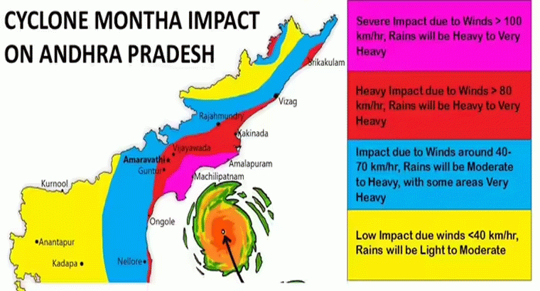 ఆంధ్రప్రదేశ్ రాష్ట్రాన్ని మొంథా తుపాను భయపెడుతోంది. ఈ నేపథ్యంలో ప్రభుత్వం అప్రమత్తమై సన్నాహక చర్యలు చేపట్టింది. అన్ని శాఖల అధికారులను కూడా అప్రమత్తం చేసింది. మరోవైపు ఆగ్నేయ బంగాళాఖాతంలో తీవ్రవాయుగుండం కేంద్రీకృతమైనట్లు ఏపీ విపత్తుల నిర్వహణ సంస్థ తెలిపింది. గడిచిన 6 గంటల్లో గంటకు 6 కి.మీ వేగంతో వాయుగుండం కదులుతోందని వెల్లడించింది. రాబోయే 24 గంటల్లో ఈ వాయుగుండం తుపానుగా బలపడే అవకాశం ఉందని ఏపీ విపత్తుల నిర్వహణ సంస్థ ఎండీ ప్రఖర్ జైన్ ఆదివారం మధ్యాహ్నం ఒంటిగంట సమయంలో వెల్లడించారు. ఆదివారం మధ్యాహ్నం సమయానికి ఈ వాయుగుండం పోర్ట్ బ్లెయిర్కి 620 కి.మీ, చెన్నైకి 780 కి.మీ, విశాఖపట్నానికి 830 కి.మీ, కాకినాడకు 830 కిలోమీటర్ల దూరంలో కేంద్రీకృతమైనట్లు తెలిపారు.